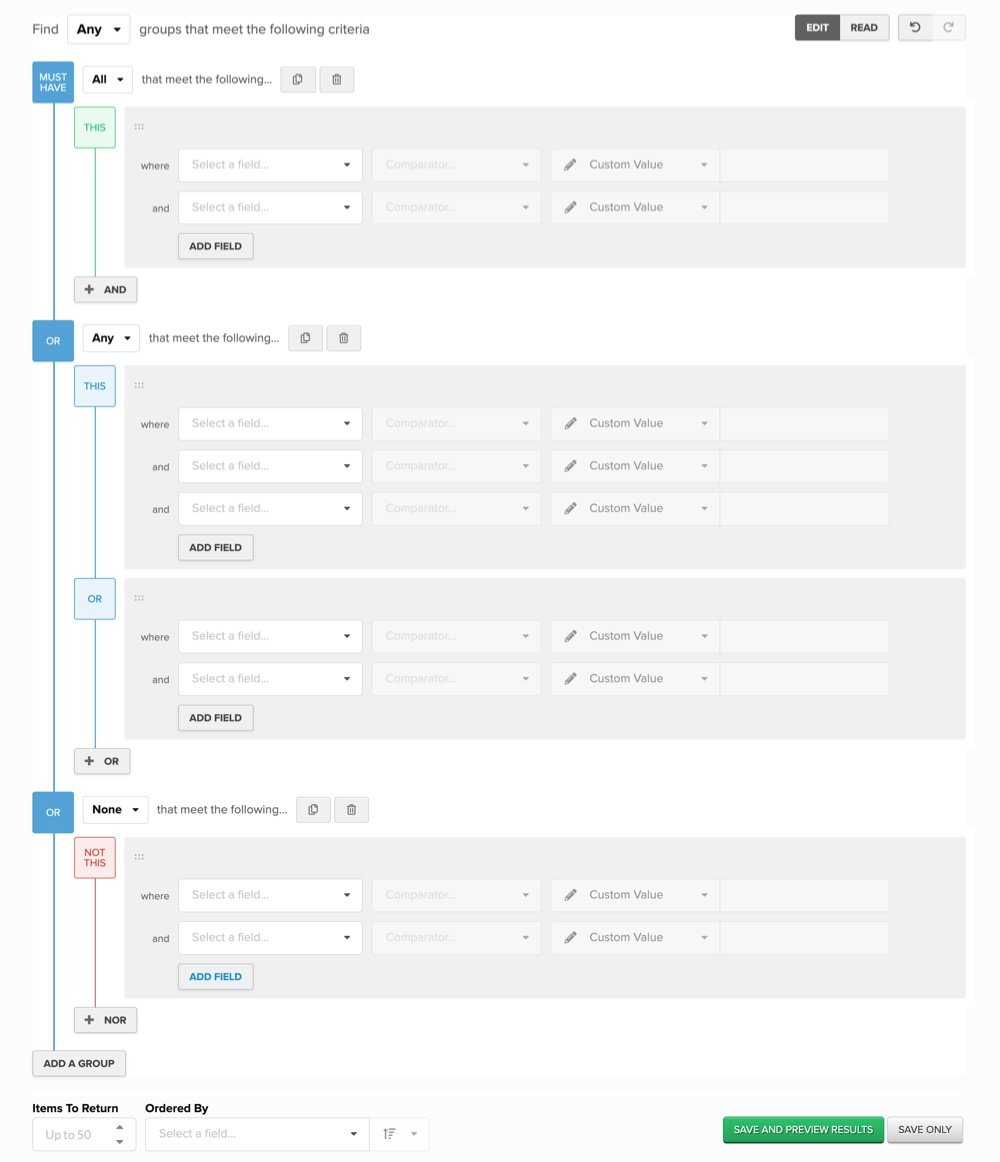 The Collection Builder has the following interface (this example shows a sample collection definition with empty search criteria):